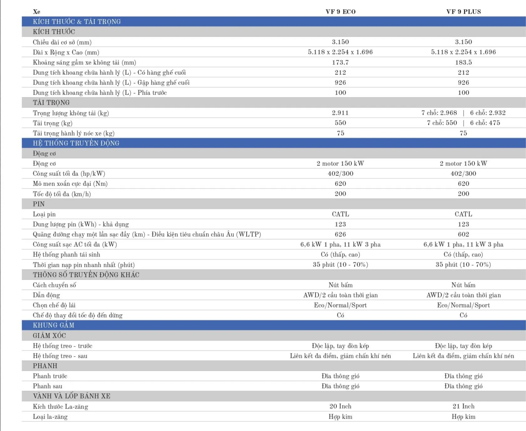Vốn là mẫu xe đầu bảng của VinFast nên các thông số kích thước của VF 9 cũng lớn nhất trong chuỗi sản phẩm của hãng. Theo đó, chiều dài x rộng x cao của xe lần lượt là 5.120 x 2.000 x 1.721 (mm), tương đương với loạt mẫu SUV hạng sang như Lexus LX570, Mercedes-Benz GLS hay BMW X7.